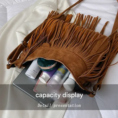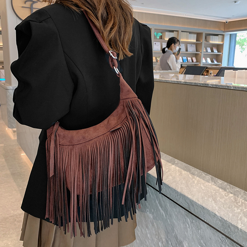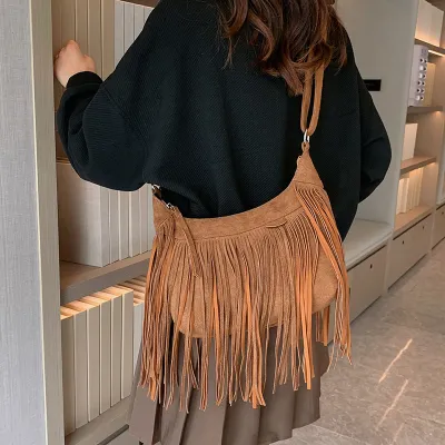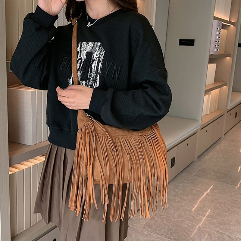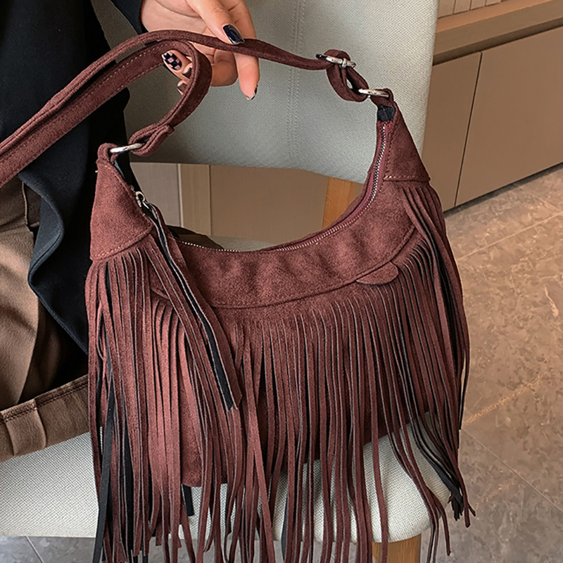 Soft suede texture meets boho-chic tassels — a retro-luxury crossbody for expressive girls and everyday free-style fashion.