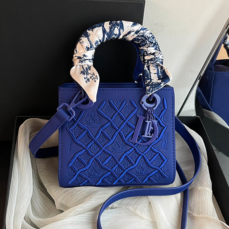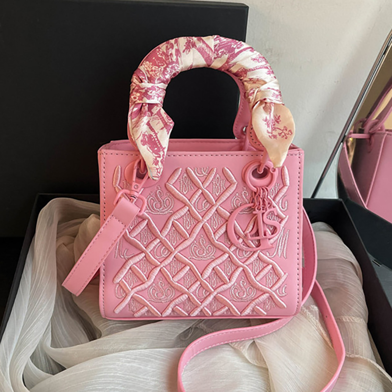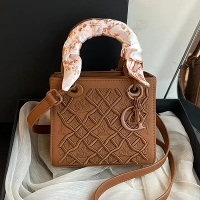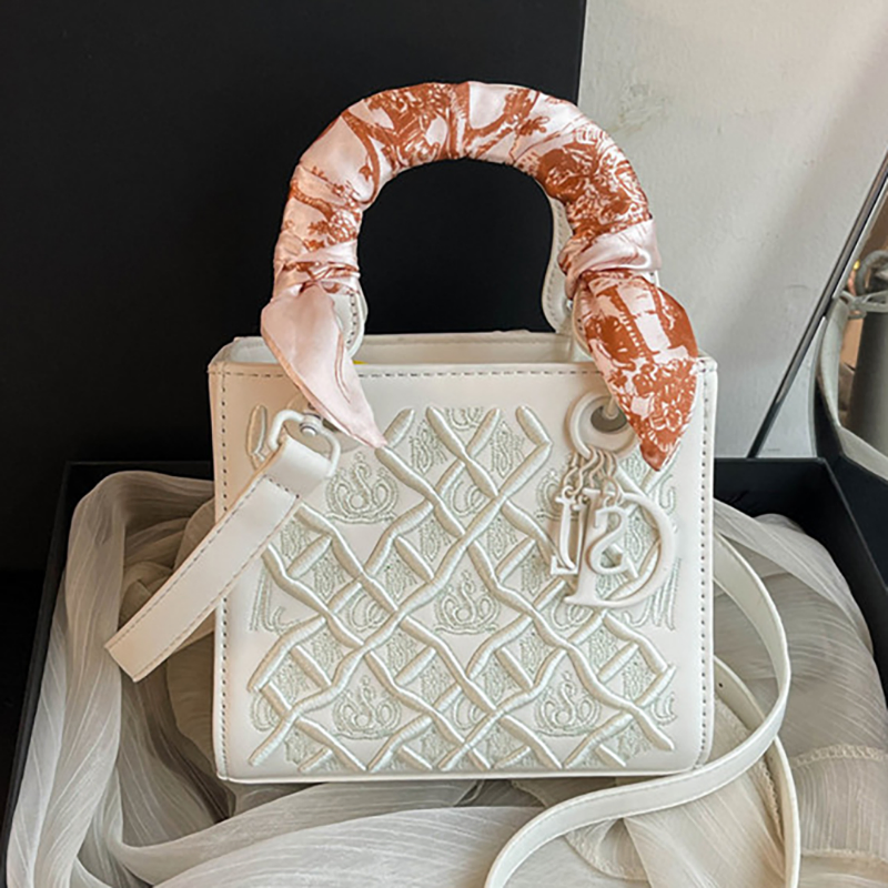 Made from premium PU leather, this vertical square handbag features delicate embroidery, a luxurious silk scarf accent, and diamond-inspired detailing, making it an exquisite choice for women who adore elegance with personality.