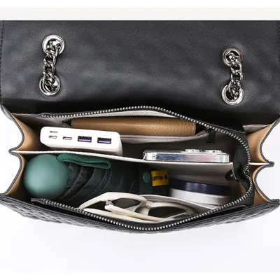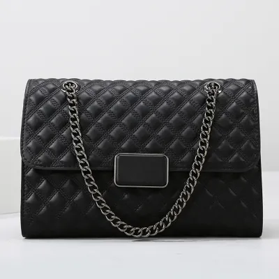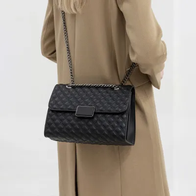 Made from premium leather, this horizontal square bag combines elegance and functionality with its diamond-patterned plaid stitching and chic metal chain design. The magnetic buckle closure ensures convenience and security, while the large capacity interior easily fits your daily essentials.