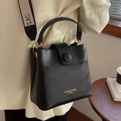 Crafted from high-quality PU leather, this bucket-style handbag showcases beautiful contrasting colors that bring sophistication and flair to any outfit. The zipper closure ensures your essentials stay safe, while the compact size makes it perfect for on-the-go use.